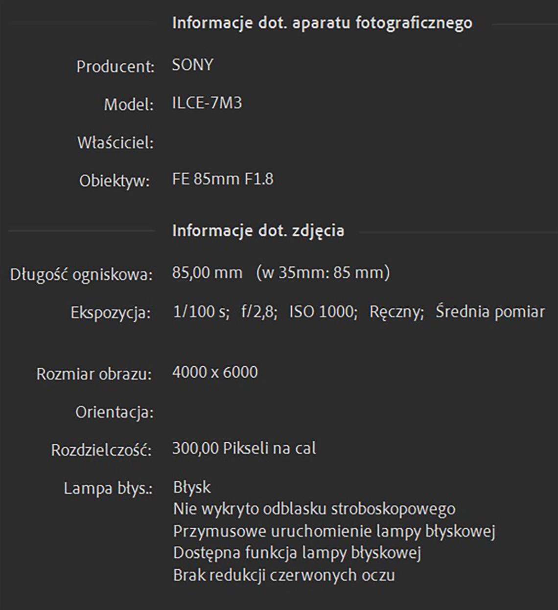 - szczegóły dotyczące ustawień ekspozycji: wartość przysłony, ISO, czas naświetlania,