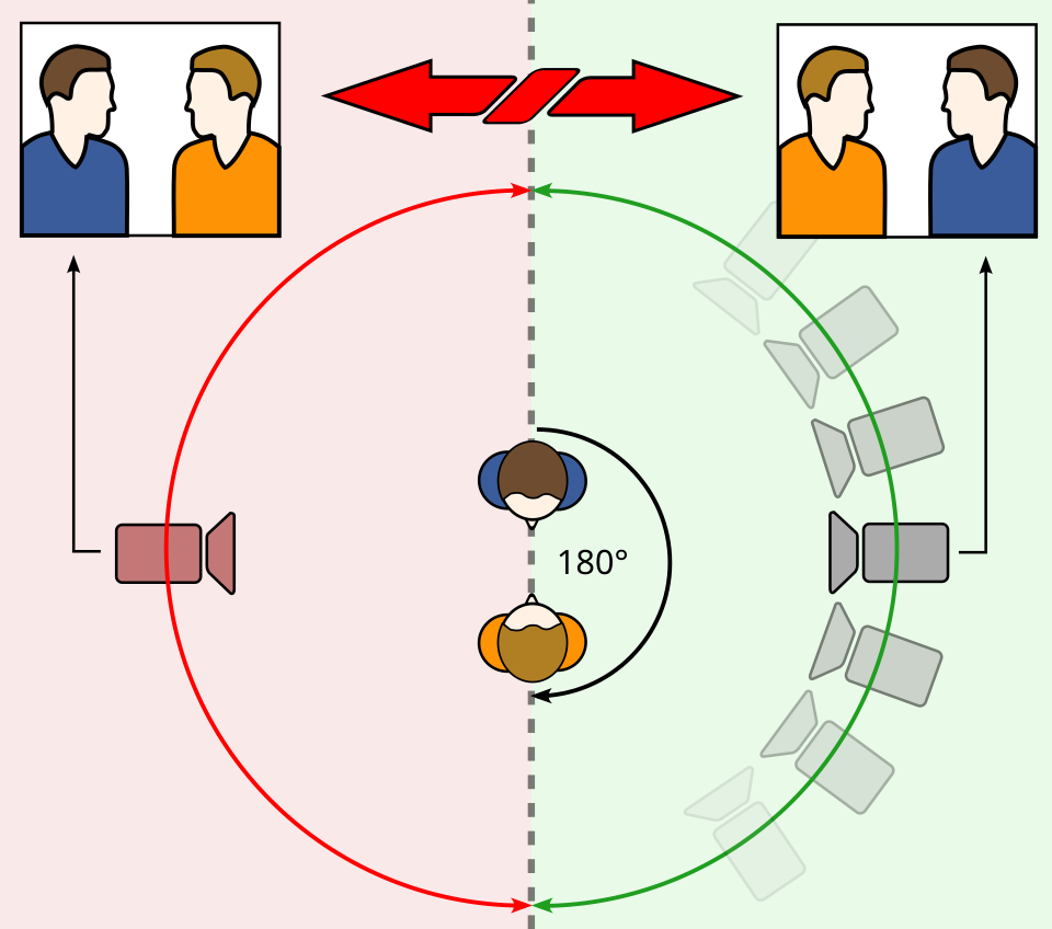 Wizualizacja reguły 180°, źródło: Wikipedia - Cięcie na akcji – nazywane także montażem na ruchu; chodzi o to, aby pokazać spójną kontynuację ruchu między dwoma ujęciami, np. początkowe otwieranie drzwi w planie bliskim kontynuować w następnym ujęciu w planie ogólnym, z innej perspektywy.