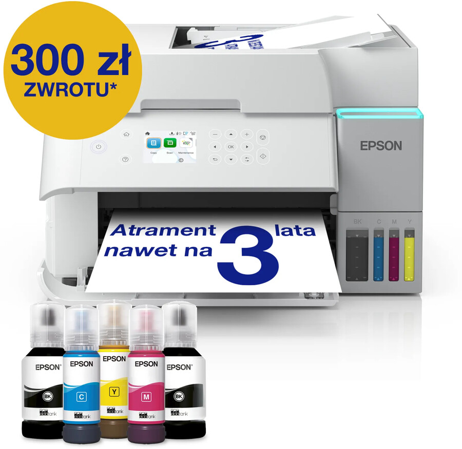 Ta ekonomiczna drukarka pozwala zaoszczędzić do 95% na kosztach druku i zawiera w zestawie atrament wystarczający nawet na 3 lata. Dołączony zestaw butelek z atramentem umożliwia wydrukowanie do 15 100 stron w trybie czarno-białym i 5500 stron w kolorze, co odpowiada 63 kartridżom z atramentem.