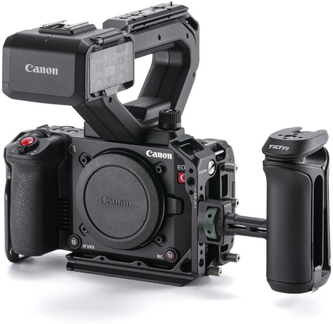 Pełna klatka na kamerę firmy Tilta do aparatu Canon C50 osłania kamerę ochronną powłoką, oferując jednocześnie różnorodne możliwości montażu akcesoriów. Ta aluminiowa klatka charakteryzuje się modułową konstrukcją pełną/połowiczną, szyną NATO, mocowaniem stopki, płytą dolną typu Arca, trzypunktowym mocowaniem, zaciskami kablowymi HDMI i USB-C oraz wieloma gwintami 1/4"-20 i 3/8"-16 zapobiegającymi skręcaniu.