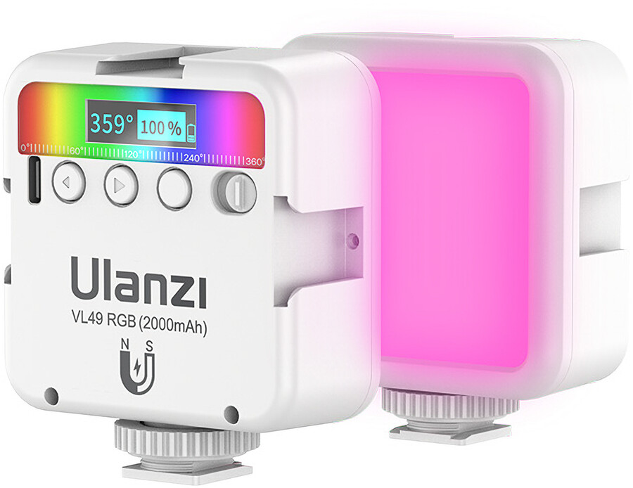 Ulanzi Vl49RGB posiada możliwość ustawienia jeden z aż 360 kolorów. Zapewni to niesamowity efekt twoim nagraniom i umożliwi stworzenie oryginalnej scenerii dla zdjęć. Lampa posiada też regulację barwy białego światła od zimnego niebieskiego, przez naturalnie białe światło dzienne, po ciepły żółty w zakresie 2500-9000K. Wszystko to możesz ustawić za pomocą czytelnego cyfrowego wyświetlacza. Czas pracy przy maksymalnej mocy to 120 min natomiast przy minimalnej mocy oświetlenia to aż do 10 godzin. Akumulator ładujemy za pomocą portu USB-C dołączonym do zestawu przewodem. Do ładowania można użyć standardowej ładowarki do smartfona czy podłączyć ją do powerbanku. Czas ładowania wynosi ok 2 godzin.