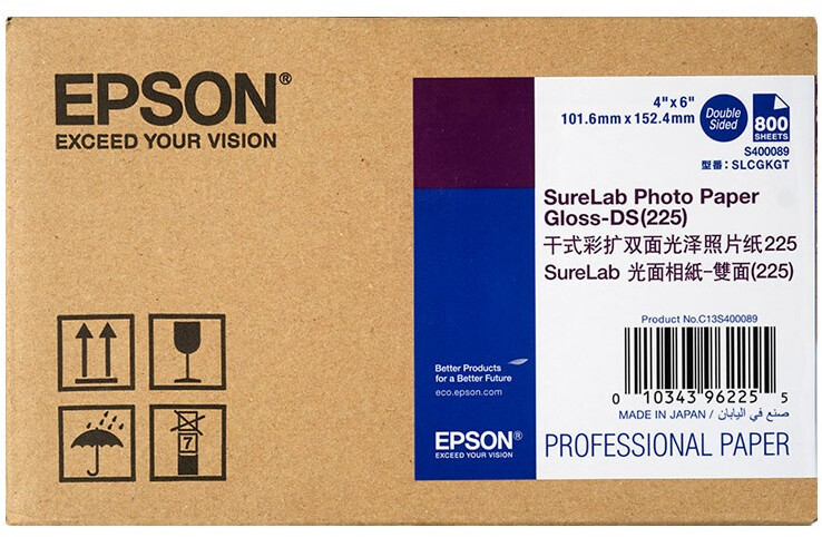 Dwustronny papier fotograficzny Epson SureLab Gloss w formacie 10x15 cm, o gramaturze 225 g/m², pakowany po 800 arkuszy, z powłoką żywiczną (RC) odporną na zarysowania. Jest to profesjonalny papier o wykończeniu na wysoki połysk, przeznaczony do druku komercyjnego w urządzeniu SureLab SL-D500/D1000A. Idealny do kalendarzy, kart i książek fotograficznych. Potencjalne obszary zastosowań: zakłady fotograficzne, punkty usługowe, hotelarstwo, działalność projektowa i artystyczna oraz inne, w których ceni się wszechstronność druku dwustronnego umożliwiającego poszerzenie kreatywnych zastosowań.
