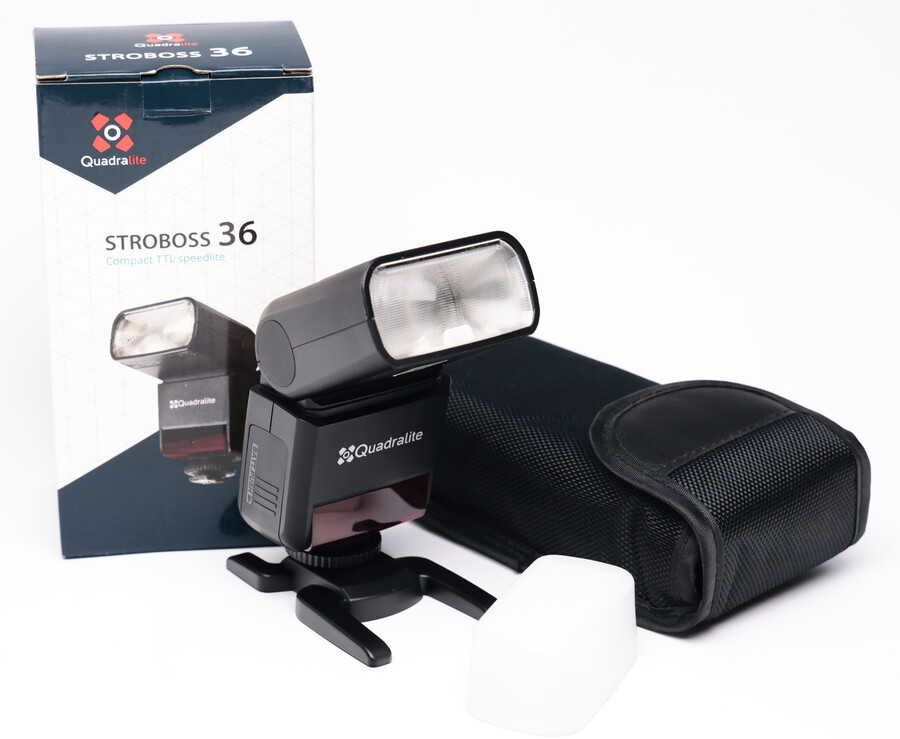 Quadralite Stroboss 36 to mała i lekka lampa błyskowa o liczbie przewodniej 36, która idealnie pasuje do aparatów bezlusterkowych oraz kompaktowych. Waży jedynie 200 g a po zamontowaniu na aparat i skierowaniu głowicy do przodu ma jedynie 95 mm wysokości. Pomimo tak niewielkich rozmiarów jej głowica błyskowa obraca się w zakresie 270º w płaszczyźnie poziomej oraz 97º w pionowej. Pozwala to na dużą swobodę w odbijaniu światła błyskowego od sufitu i ścian niezależnie od zorientowania aparatu na zdjęcia w kadrze portretowym i poziomym.
