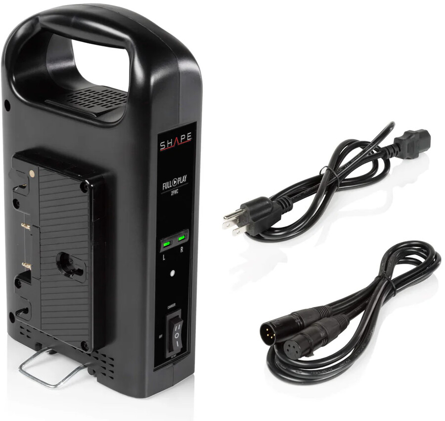 Podłącz 4-pinowy XLR do aparatu lub światła za pomocą dołączonego 4-pinowego kabla XLR i używaj ładowarki jako zasilacza prądu stałego o mocy do 60 watów. Kompaktowa pionowa konstrukcja SHAPE Intelligent Dual V-Mount jest łatwa do transportu za pomocą górnego uchwytu, a wewnętrzny zasilacz może obsługiwać napięcia AC na całym świecie.