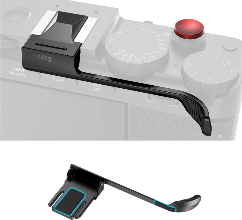 Zaprojektowano, aby poprawić chwyt i zwiększyć bezpieczeństwo podczas trzymania aparatu jedną ręką. Uchwyt na kciuk można łatwo zamontować, wsuwając go w gorącą stopkę aparatu. Wklęsła konstrukcja uchwytu zwiększa bezpieczeństwo i wygodę podczas fotografowania jedną ręką, ułatwiając tworzenie treści. Na uchwycie kciuka wygrawerowano falę dźwiękową „FUJIFILM” i rok założenia aparatu Wbudowane silikonowe podkładki chronią korpus aparatu i elementy elektroniczne gorącej stopki przed kurzem, rdzą i zwarciami. W zestawie jest również przycisk zwalniania migawki, aby zapewnić miękkie i wygodne dotykanie palcem.