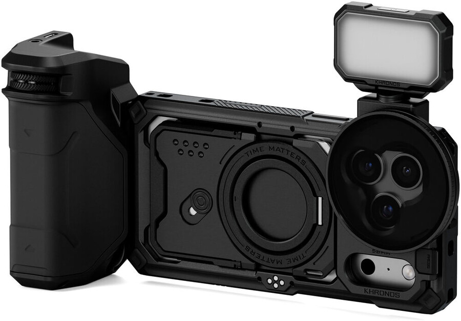 W zestawie znajduje się uchwyt Khronos Focus PD , który zapewnia dodatkowe zasilanie systemu i większą kontrolę nad funkcjami ostrości i zoomu w iPhonie. Uchwyt ten wykorzystuje ten sam innowacyjny mechanizm blokujący, co inne akcesoria Khronos, i jest wyposażony w wewnętrzny akumulator ładowany przez USB-C.