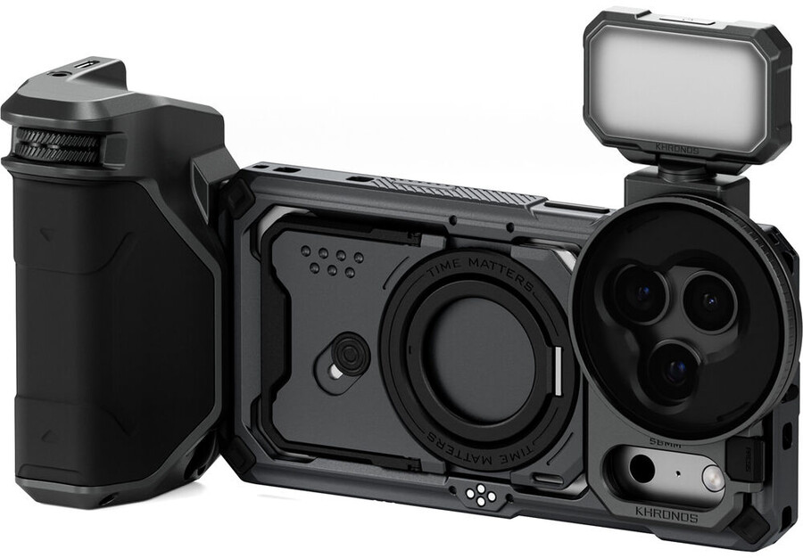 W zestawie znajduje się uchwyt Khronos Focus PD , który zapewnia dodatkowe zasilanie systemu i większą kontrolę nad funkcjami ostrości i zoomu w iPhonie. Uchwyt ten wykorzystuje ten sam innowacyjny mechanizm blokujący, co inne akcesoria Khronos, i jest wyposażony w wewnętrzny akumulator ładowany przez USB-C.